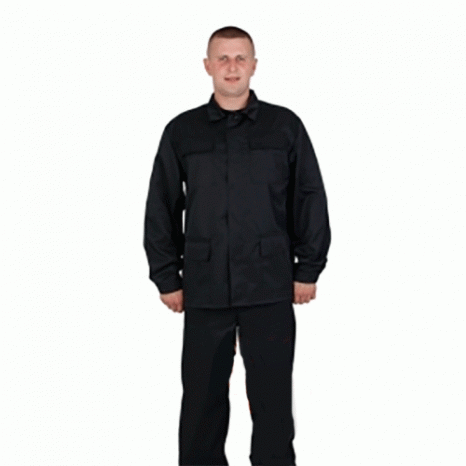 Костюм состоит из куртки и брюк. Куртка прямого силуэта с отложным воротником и супатной застежкой на пуговицах. Имеет накладные карманы с клапанами: два нагрудных и два боковых. Рукав прямой.