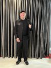 Костюм состоит из куртки и брюк. Куртка прямого силуэта с отложным воротником и супатной застежкой на пуговицах.